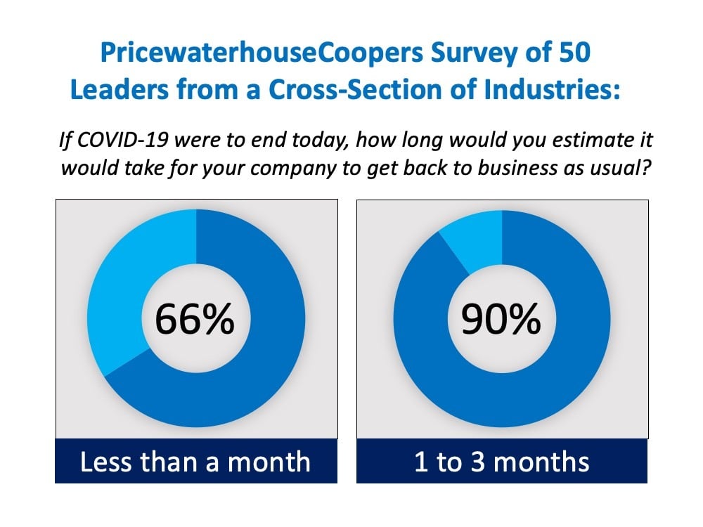 With this historical analysis in mind, many business owners are also optimistic for a bright economic return. A recent PricewaterhouseCoopers survey shows this confidence, noting 66% of surveyed business owners feel their companies will return to normal business rhythms within a month of the pandemic passing, and 90% feel they should be back to normal operation 1 to 3 months after: