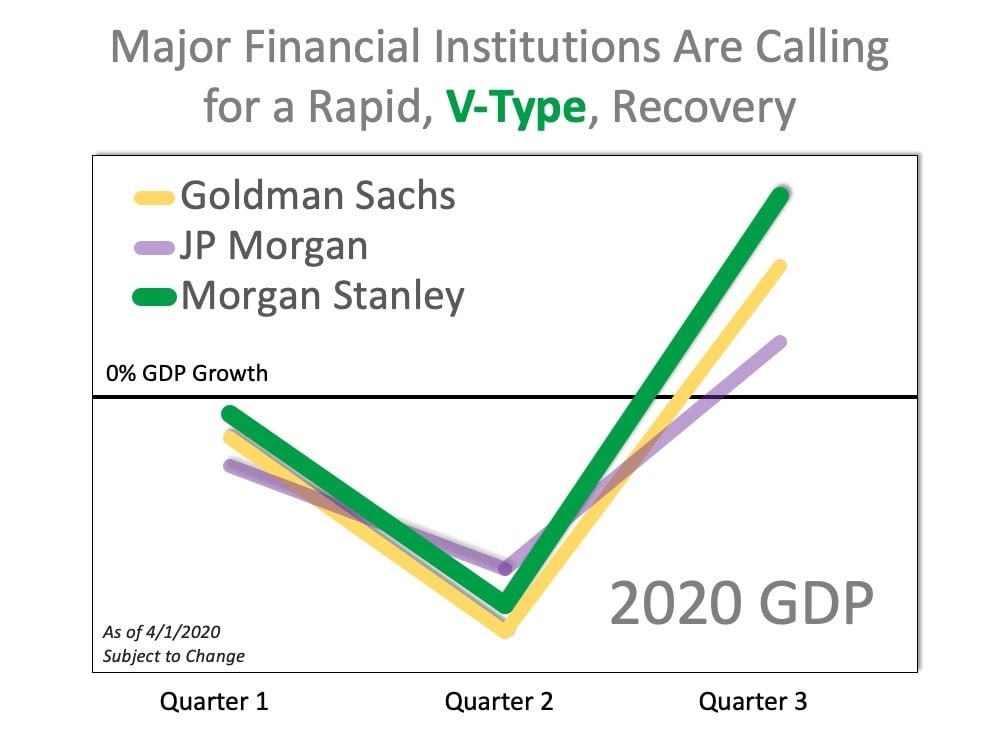 When looking at GDP (the measure of our country’s economic health), a survey of three leading financial institutions shows a projected sharp decline followed by a steep rebound in the second half of this year: